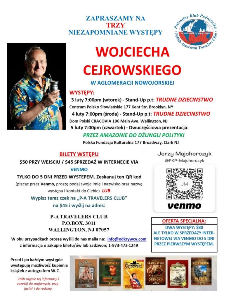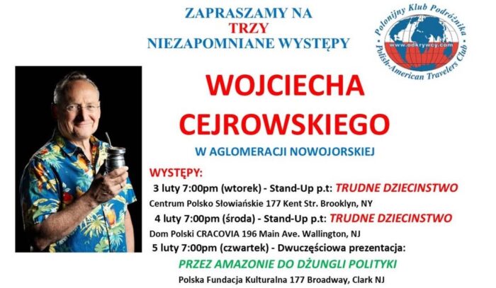 Serdecznie zapraszamy na spotkanie z Wojciechem Cejrowskim w 5 lutego (czwartek) 2026 o godzinie 7 wieczorem w Polskiej Fundacji Kulturalnej w Clark NJ, będzie to dwuczęściowa prezentacja pod tytułem “Przez Amazonię do dżungli polityki.” Jest to jedno z 3 spotkań w aglomeracji nowojorskiej szczegóły na plakacie.